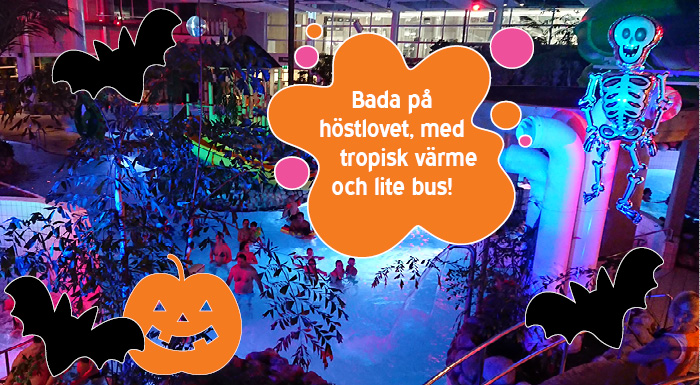 Välkommen till Fyrishov i Uppsala på höstlovet vecka 44. Äventyrsbad med tropisk värme och 30 grader i vattnet. Här kan hela familjen ha roligt tillsammans. Missa inte våra Halloweenbus i badet onsdag-lördag. (Vi kommer att skrämmas lite...)